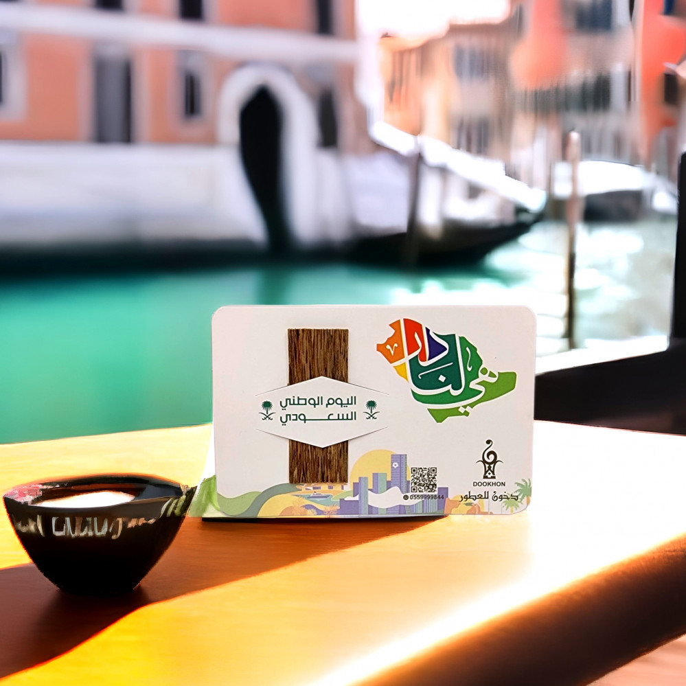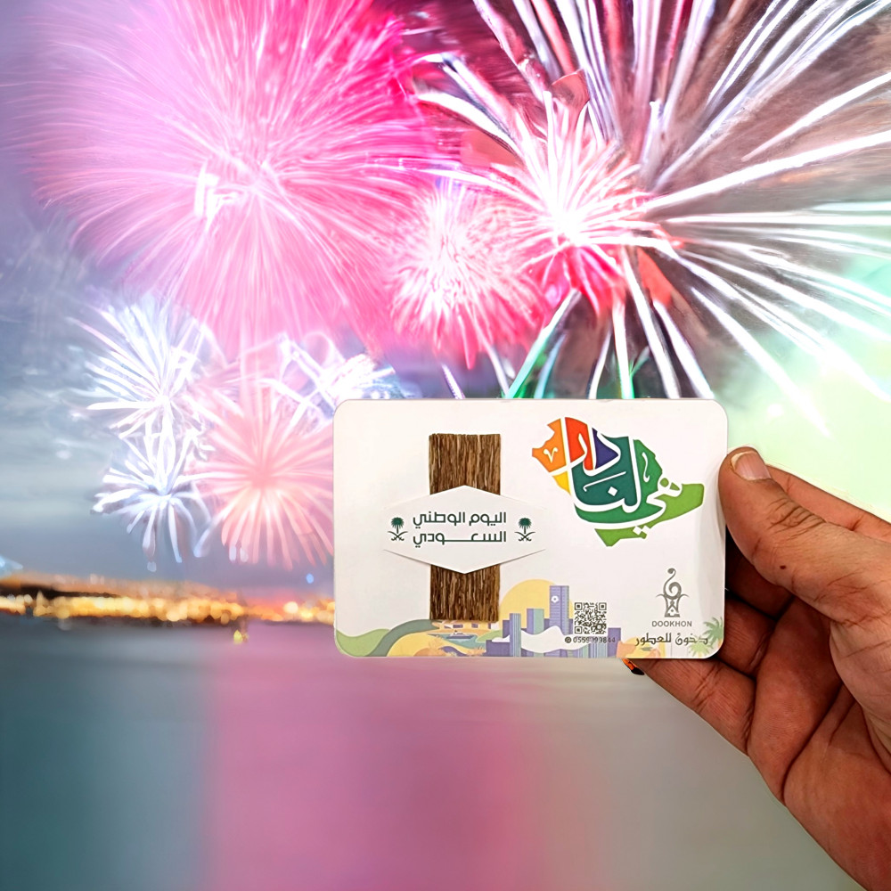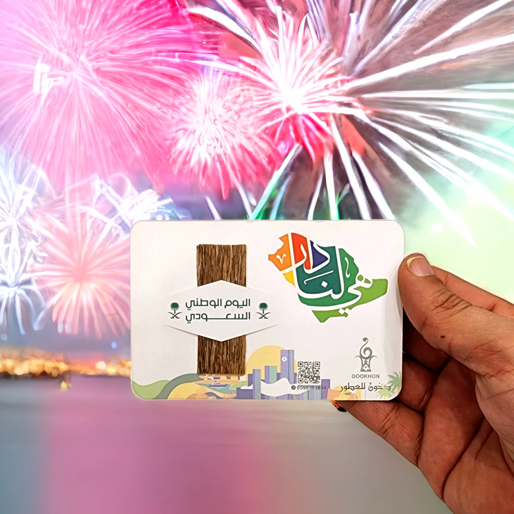 توزيعات راقية بمناسبة اليوم الوطني السعودي، تضفي لمسة من الفخامة وروح الوطنية. التوزيعة تتكون من قطعة عود شرقي مغلفة بعناية مع كرت يحمل تصميمًا مميزًا للاحتفال باليوم الوطني، كل ذلك بتغليف شفاف فاخر.