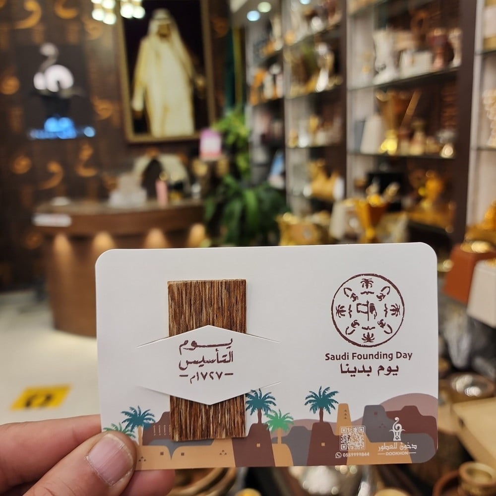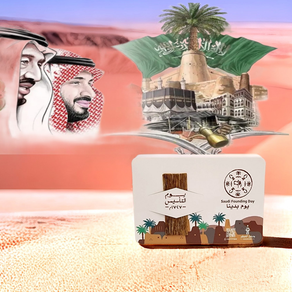 توزيعات يوم التأسيس السعودي بتصميم راقٍ يعكس الهوية الوطنية والاعتزاز بالتراث. تحتوي التوزيعة على قطعة عود فاخر مغلفة بتغليف شفاف فاخر يبرز جودتها، مرفقة بكرت يحمل شعار أو عبارات خاصة بهذه المناسبة الوطنية.