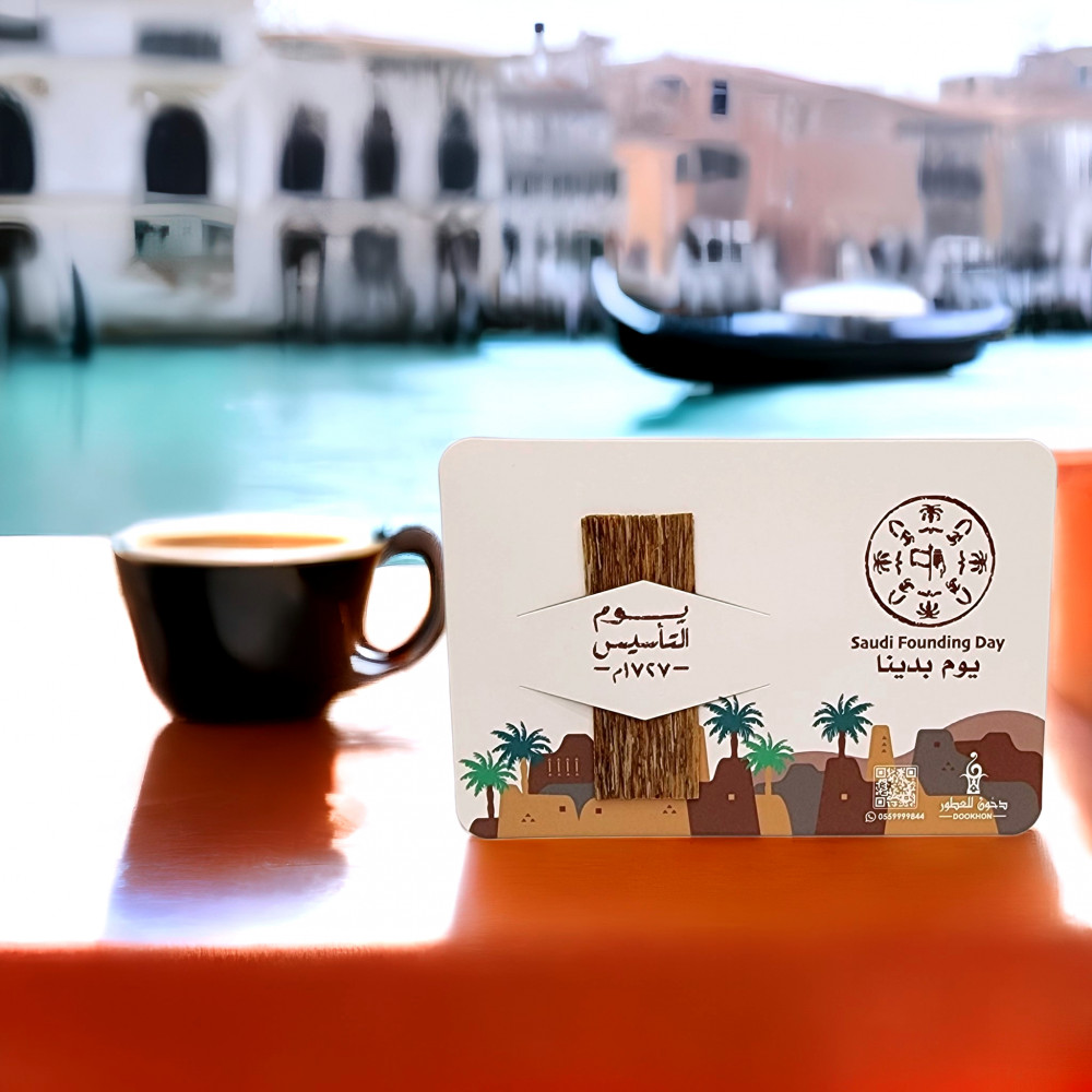 • الكرت: تصميم أنيق يحمل شعار يوم التأسيس السعودي وعبارات مميزة مثل "فخر الوطن" أو "تاريخنا مجد".