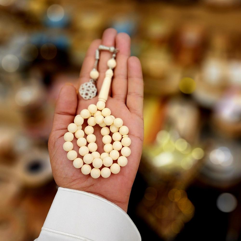 مسبحة بكلايت أبيض عاجي مع علبة فخمة وكيس للإهداء – من دخون للعطور