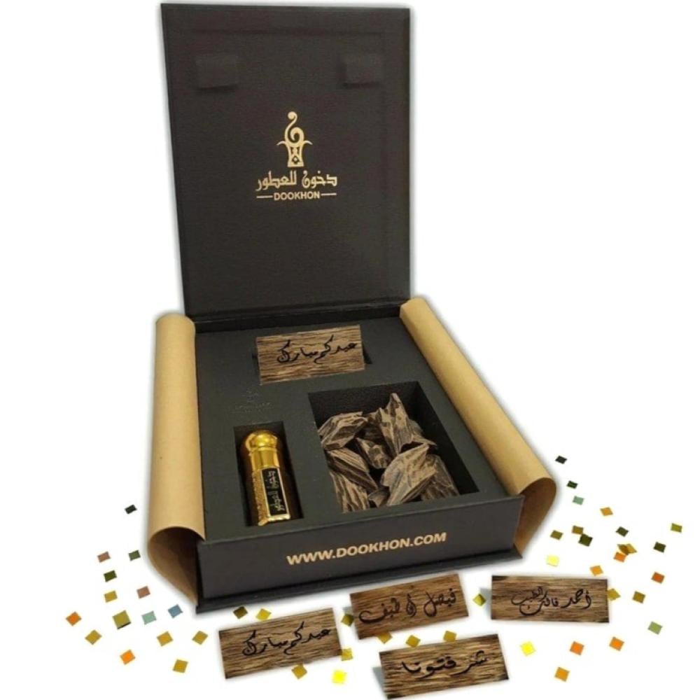 3️⃣ قطعة العود المحفورة: اللمسة الشخصية؛ قطعة عود طبيعي ننحت عليها الاسم أو العبارة بالليزر لتكون ذكرى لا تنسى.