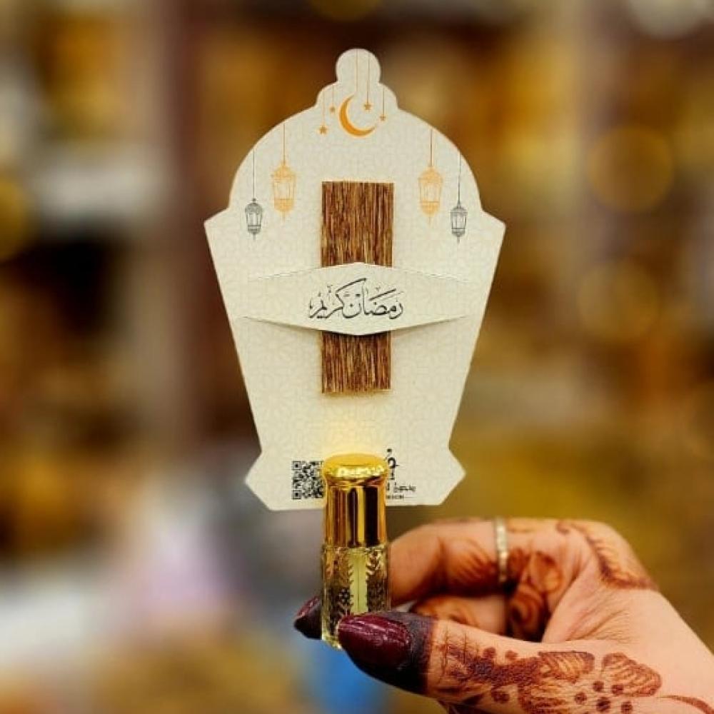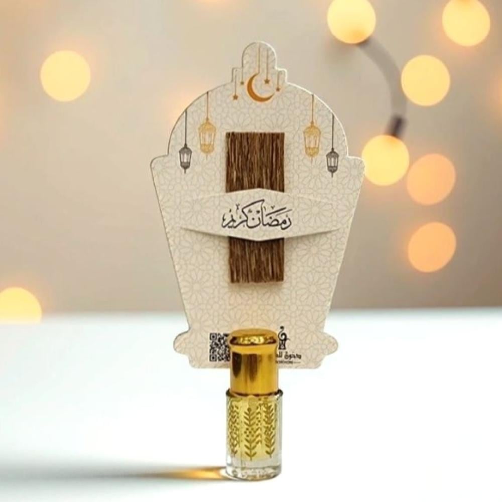 - كرت إهداء: تصميم رمضاني مميز (8×12 سم) يُثبت عليه العود والدهن بشكل فني جذاب.